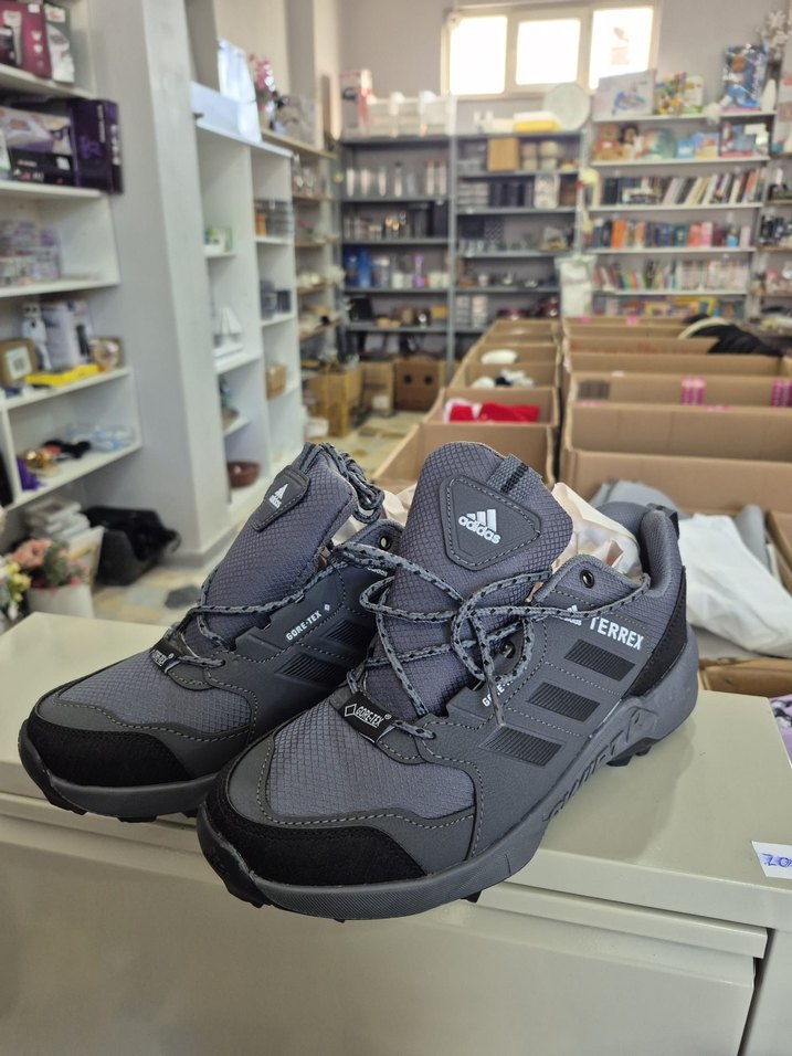 Gri Adidas Terrex erkek outdoor ayakkabılar, kauçuk tabanlı ve cırt cırtlı, rahat ve şık sokak stili için uygundur.