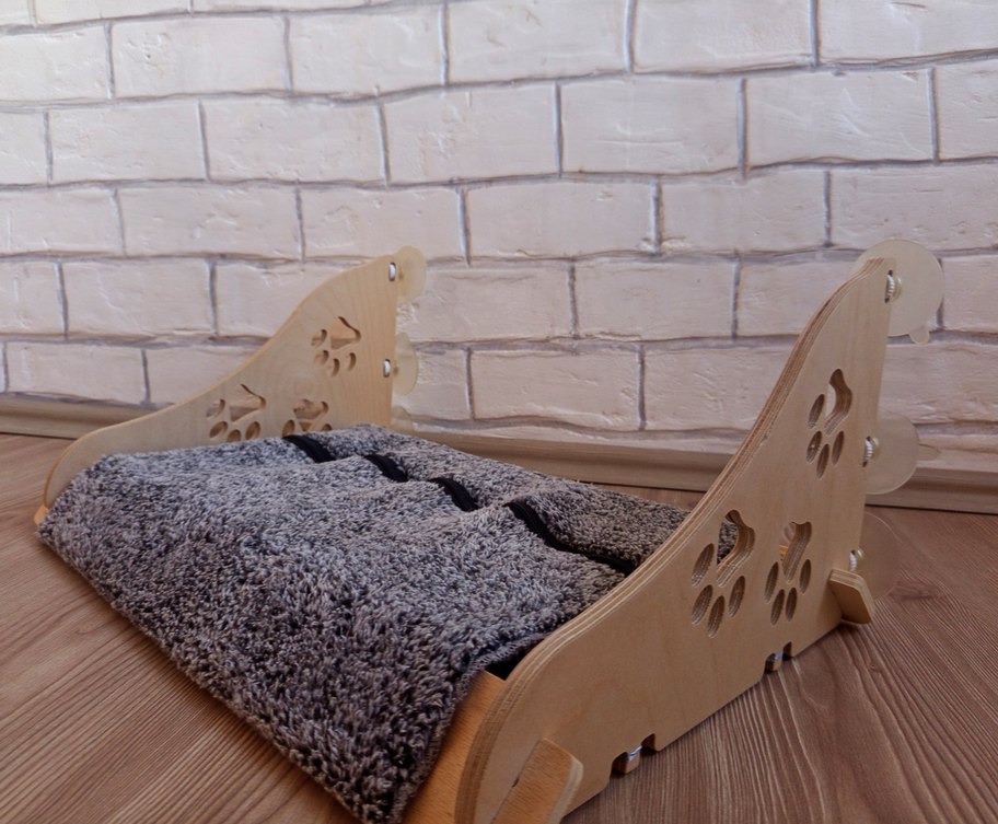 Dekoratif yan panellere sahip gri ahşap kedi yatağı, yumuşak gri battaniye ile birlikte rahat bir uyku alanı sunar.