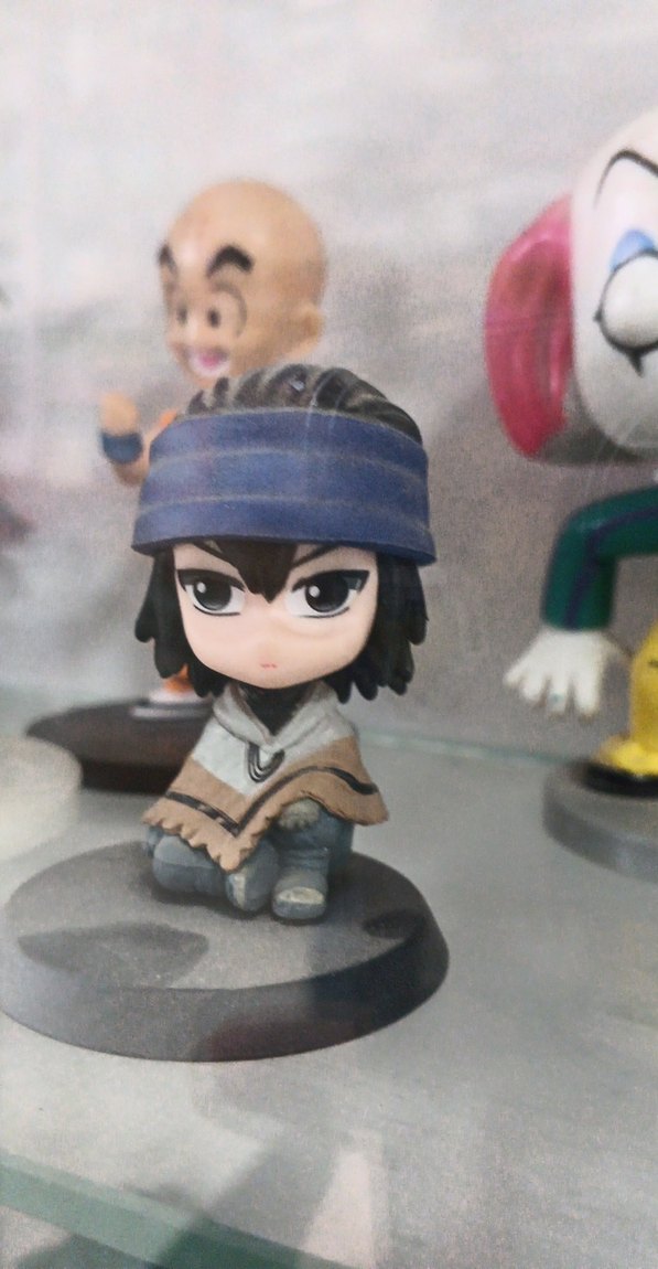 Mavi saç bandı ve detaylı yüz ifadesine sahip küçük gri aksiyon figürü, yuvarlak taban üzerinde oturuyor.