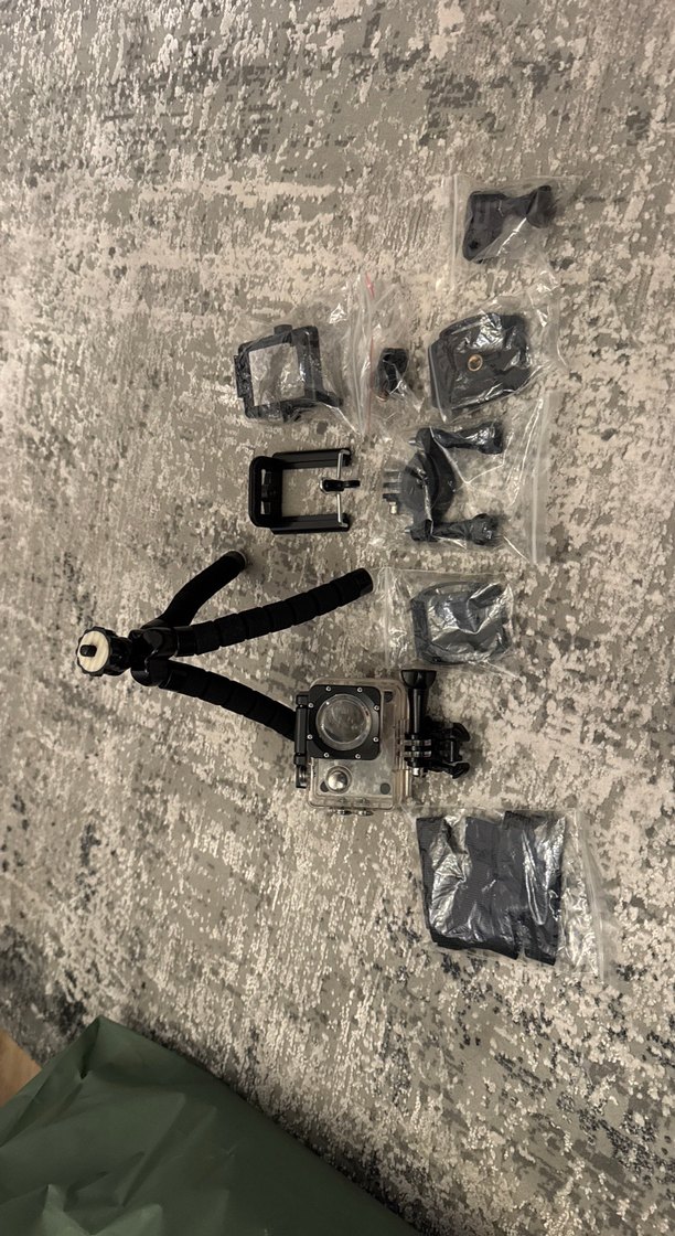 Gri renkli aksiyon kamerası ve esnek tripod ile çeşitli montaj aparatlarından oluşan set, farklı açılarda çekim yapmaya uygundur.