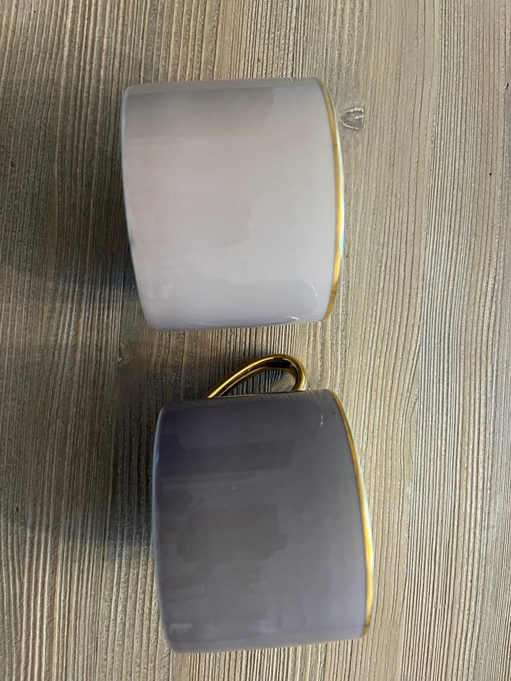 Altın detaylı kulplara ve kenarlara sahip, gri tonlarında iki seramik fincan seti. ☕