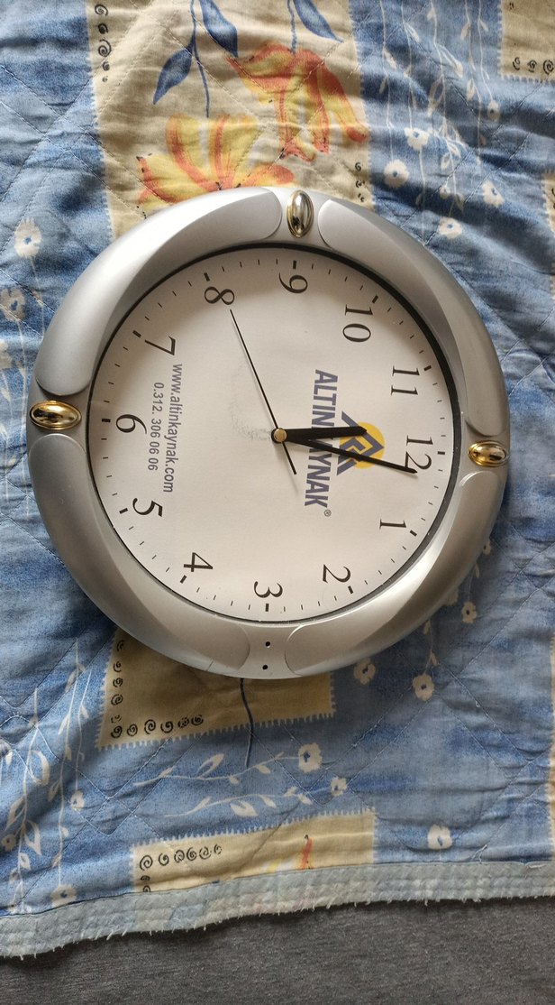 Altın Kaynak logosu ve web sitesi bulunan, altın detaylı gri yuvarlak çerçeveli duvar saati.