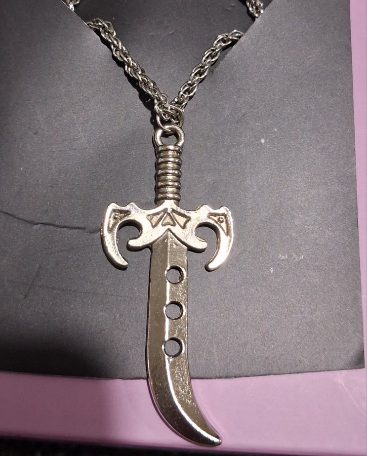 Gri ve altın renkli kılıç figürlü gotik erkek kolyesi, rock punk havası taşıyan burgu zincirle tamamlanmıştır. ⚔️