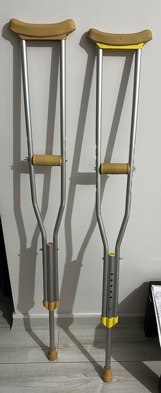 Ayarlanabilir yükseklikte, yumuşak tutma yerlerine sahip gri alüminyum koltuk değneği. Hafif ve dayanıklı tasarım.
