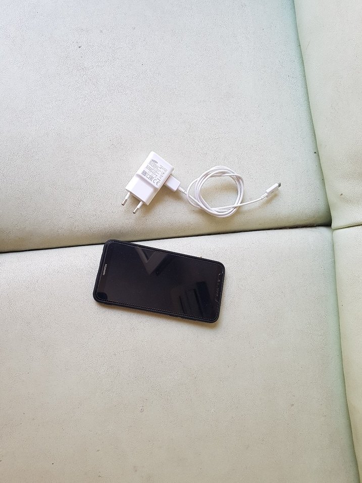 Gri renkte Android telefon ve beyaz kablolu şarj cihazı huawei 7 2018
