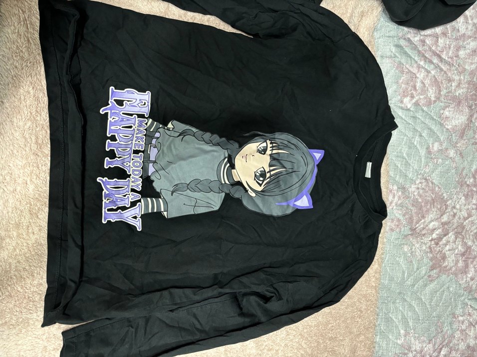 Uzun kollu siyah tişört, mor yazılı 'Make Today a Happy Day' ifadesi ve kedi kulaklı gri anime kız baskısı içerir.