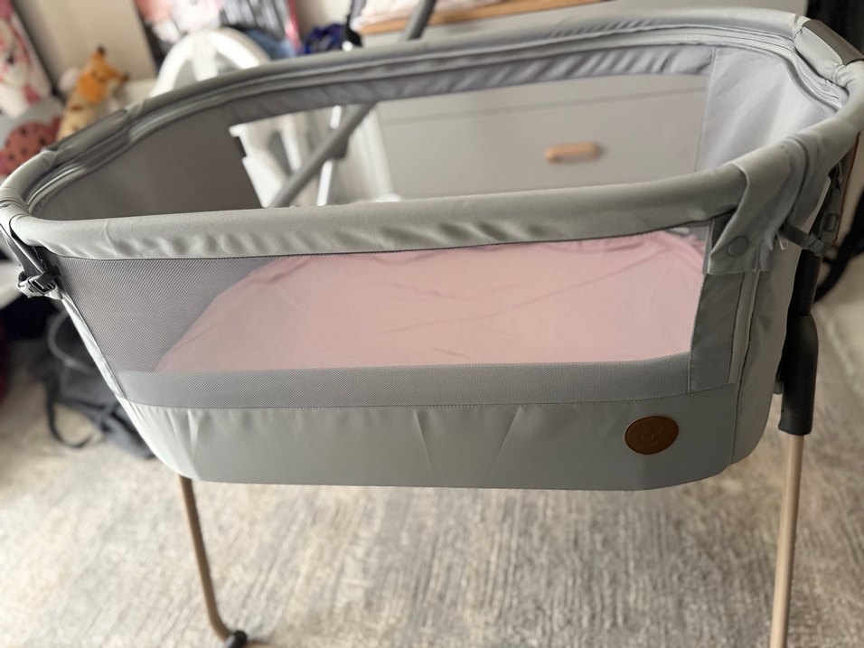 Görünür ve rahat olması için yumuşak, nefes alabilir file yan paneli bulunan gri anne yanı yatağı. Güvenli ve dinlenme için uygundur. Reflü için çocugun kafasının geldiği tarafı yükseltebilir kadeöeli şekilde kullanabilirsiniz