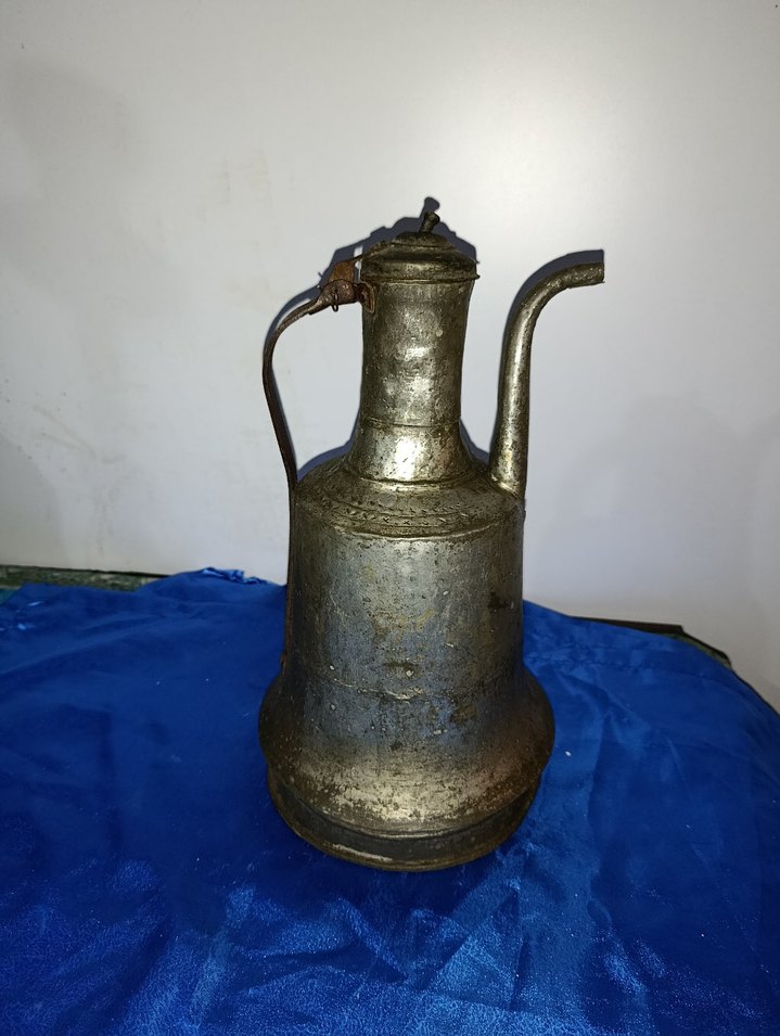 Gri renkte, uzun ve ince gövdeli, kıvrımlı ağızlı ve menteşeli kapaklı antika metal su ısıtıcısı. Sapı sağlam ve yüzeyde eski görünüm bulunur. ☕