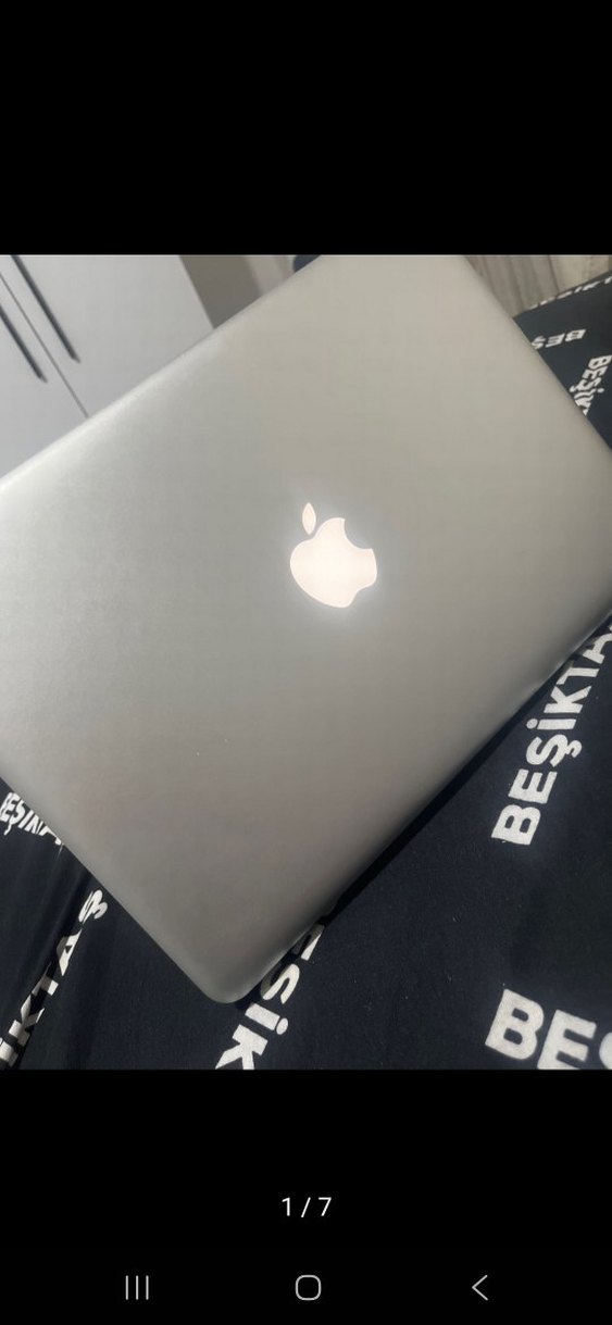 Gri renkli Apple MacBook dizüstü bilgisayar, kapakta ışıklı Apple logosu ile şık tasarıma sahip. Hafif ve taşınabilir.