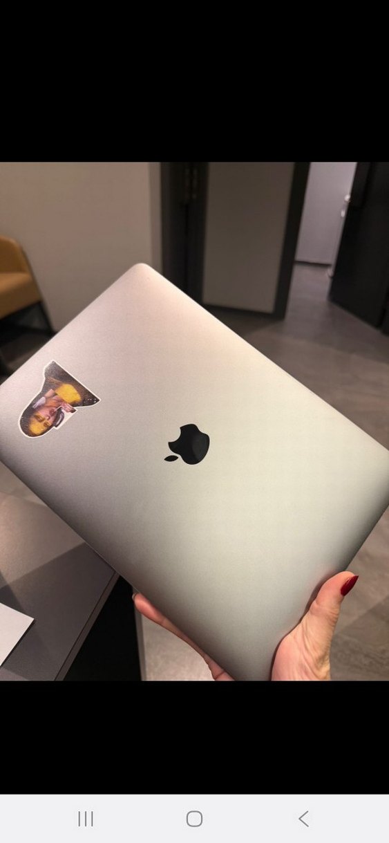 Gri renkte Apple MacBook dizüstü bilgisayar, kapakta küçük bir dekoratif çıkartma ile. 2016 MacBook Pro13"TouchBar&Touch IDInter Core i5 16GB RAM/256GB dahili hafıza