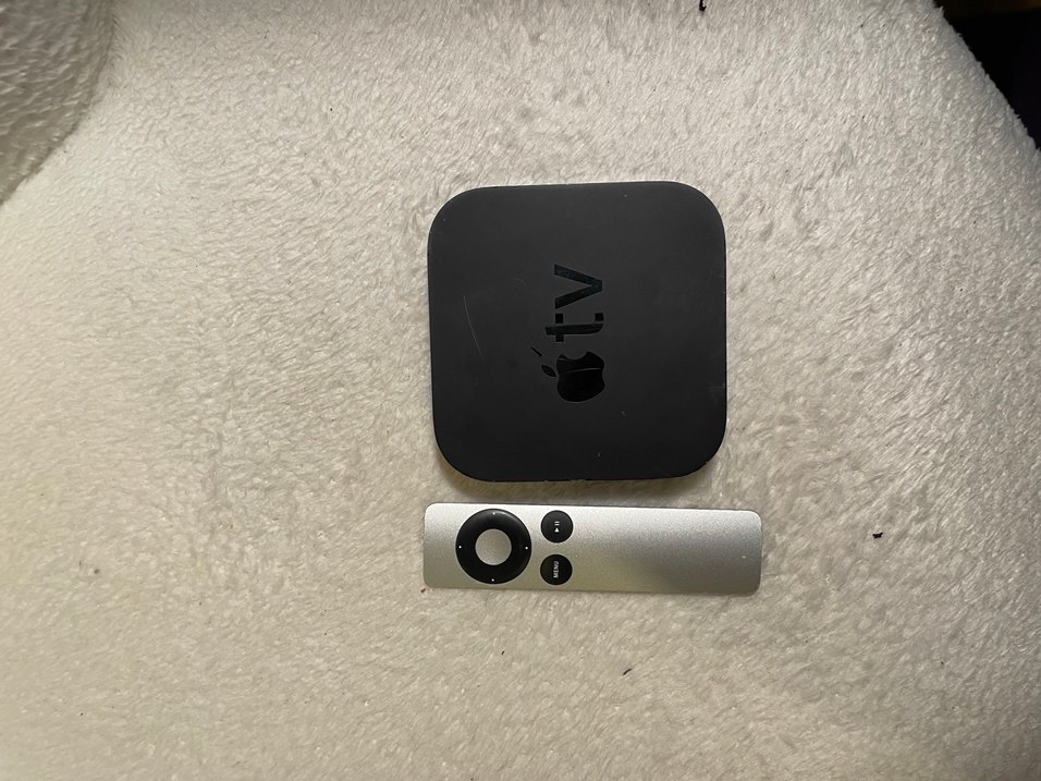 Gri Apple TV medya oynatıcı, kolay gezinme için ince bir uzaktan kumanda ile birlikte gelir. Kompakt tasarıma sahiptir.