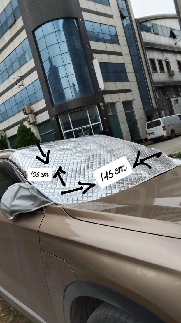 145x105 cm ölçülerinde, desen içermeyen gri araba ön cam örtüsüdür. Camı dış etkenlerden korur.