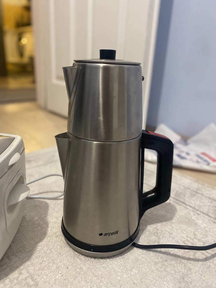 Gri renkli Arçelik çay makinesi, paslanmaz çelik gövde ve siyah kulpa sahiptir. Çay demlemek için su ısıtıcısı ve demlik içerir. Sadece üst kolu çıkmıştır