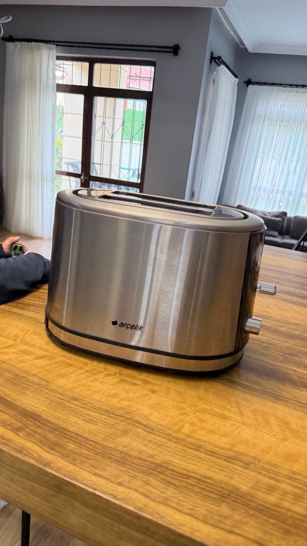 Gri renkli Arçelik ekmek kızartma makinesi, ayarlanabilir kızartma ayarları için çift kontrol düğmesine sahiptir. Geniş yuvayla farklı ekmek türlerini kızartabilir.