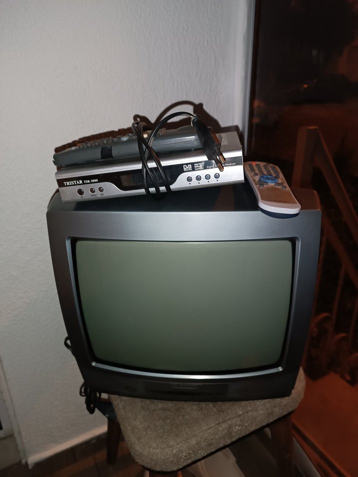 Üstünde uydu alıcısı ve uzaktan kumanda bulunan gri CRT monitör. Kablolar ve basit tasarım içerir, temel izleme ihtiyaçları için uygundur.