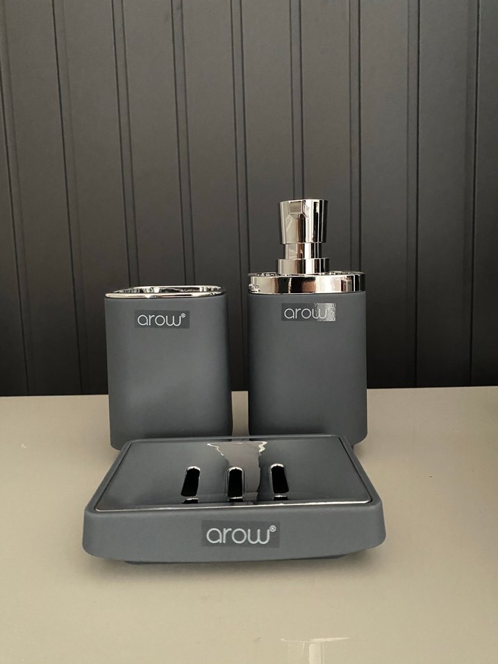 Gri renkte Arow marka banyo aksesuarseti; sıvı sabunluk, diş fırçalık ve sabunluk içerir. Modern ve şık tasarım sunar.Malzemesi plastik ama harika bir dokusu var yumuşacık hiç kullanmadım tertemiz Sıvı sabunluk pompalı şeklinde yaklaşık 16 cm dir pompasız hali 10 cm yükseklik 7 cm genişlik Sabunluk 7x10 cm dir.Diş fırçası 10 cm yükseklik 7cm genişlik iade yoktur #banyoseti#arowset#arow#dişfırçalık#fırça#bardak#sıvısabunluk#gri#sabunluk#metal#gümüş