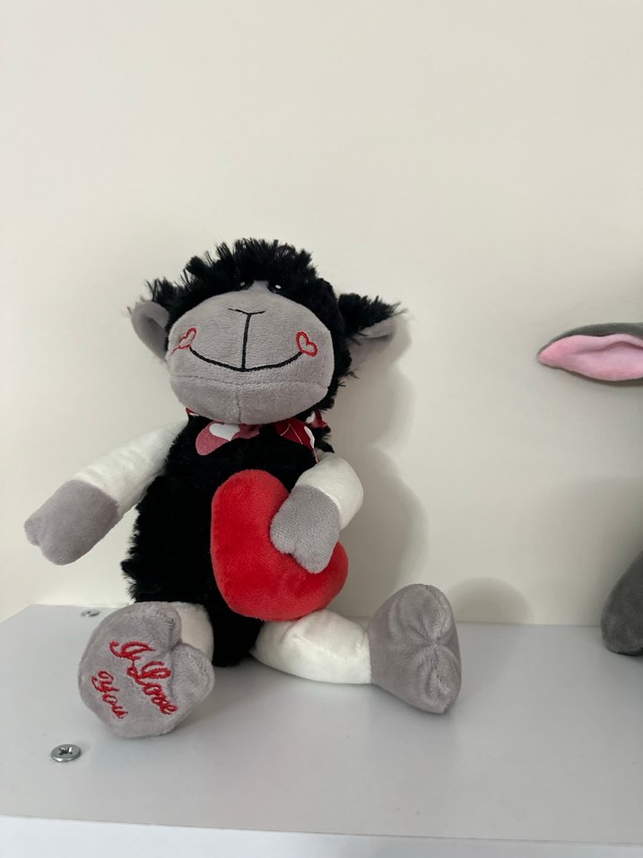 Yumuşak dokulu gri peluş oyuncak, kırmızı kalp tutuyor ve ayağında "I Love You" nakışı bulunuyor. ❤️