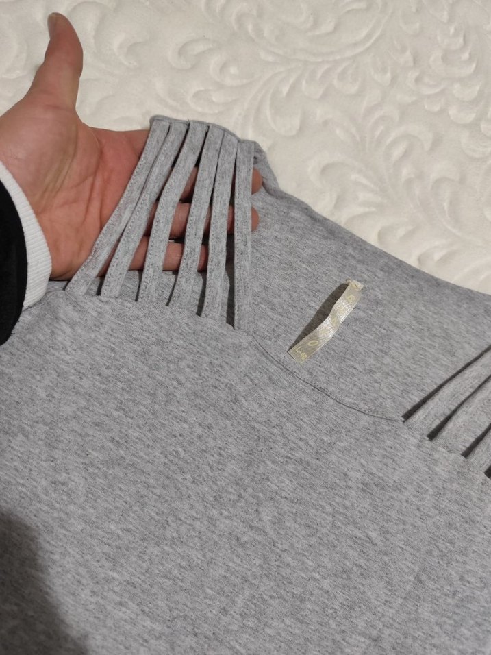 Gri, vücuda oturan tişörtü, yuvarlak yaka ve kesikli askılı kollara sahiptir. Yumuşak sentetik kumaştan, günlük sokak stili için uygundur. temiz üründür..