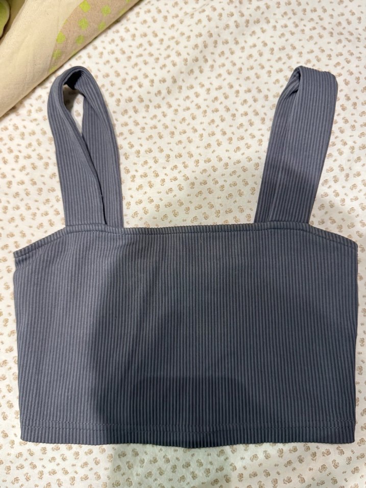Geniş askılı, askısız görünümlü, gri renkli, düz desenli, yumuşak sentetik kumaştan yapılmış, dar kesim kadın crop top. Minimalist günlük stil için uygundur.