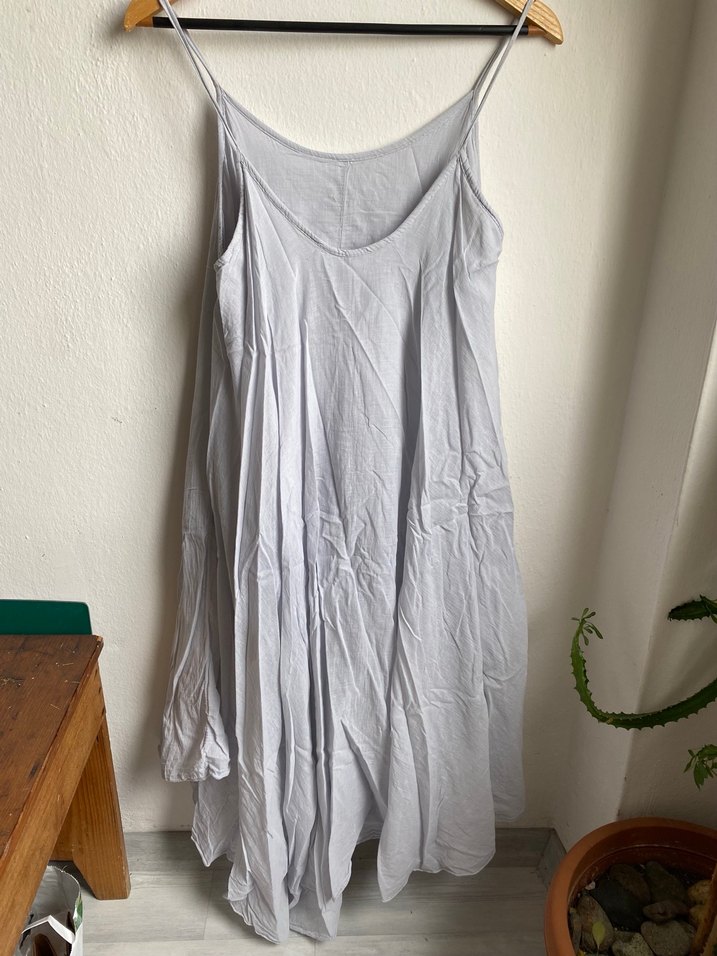 Yumuşak kumaştan, askılı, salaş kesim gri elbise. Drapeli, askısız yakası ve midi boyuyla bohem tarzını yansıtıyor.