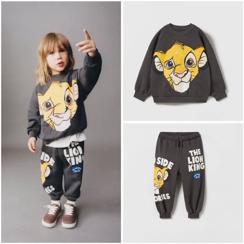 Gri renkli, rahat kesim, Aslan Kral baskılı erkek çocuk eşofman takımı. Yumuşak örme kumaştan, bisiklet yaka sweatshirt ve baskılı jogger pantolon içerir.