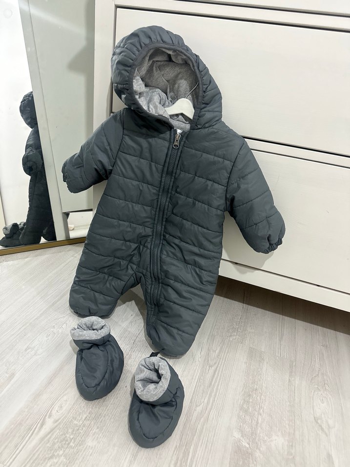 Gri renkte, peluş kumaştan erkek bebek tulumu, kapüşonlu ve kürk detaylıdır. Sokak tarzına uygun, eşleşen patiklerle birlikte gelir. ❄️ 3-6 aydır.