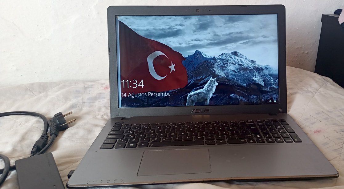 Gri ASUS laptop, tam klavye ve dokunmatik yüzeyli. şarj aleti dahildir.