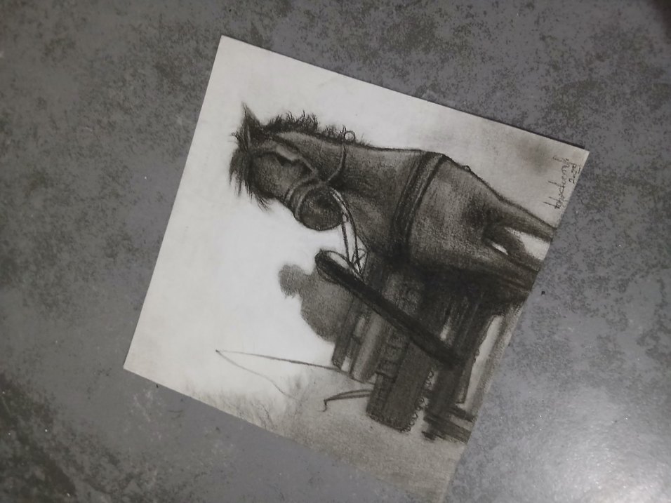 Gri At Figürlü Karakalem Resim