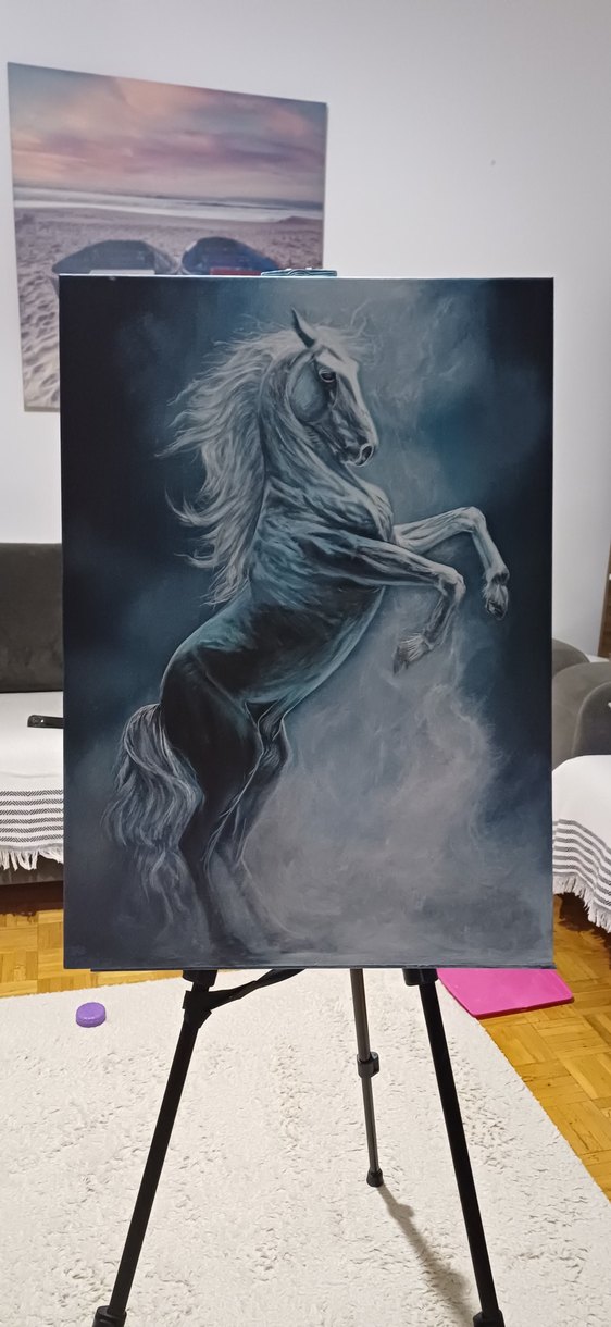 Bu tablo, sisli bir arka planda yükselen görkemli gri atı gösterir. Hareket ve güç dinamik bir şekilde yansıtılmıştır. 50×70 tuval üzerine akrilik boya çalışmam.