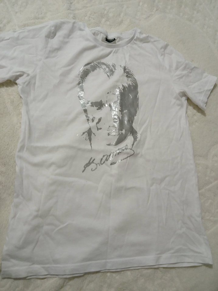 Beyaz erkek tişörtü, yumuşak pamuktan üretilmiş, önünde gri ataturk baskısı vardir.