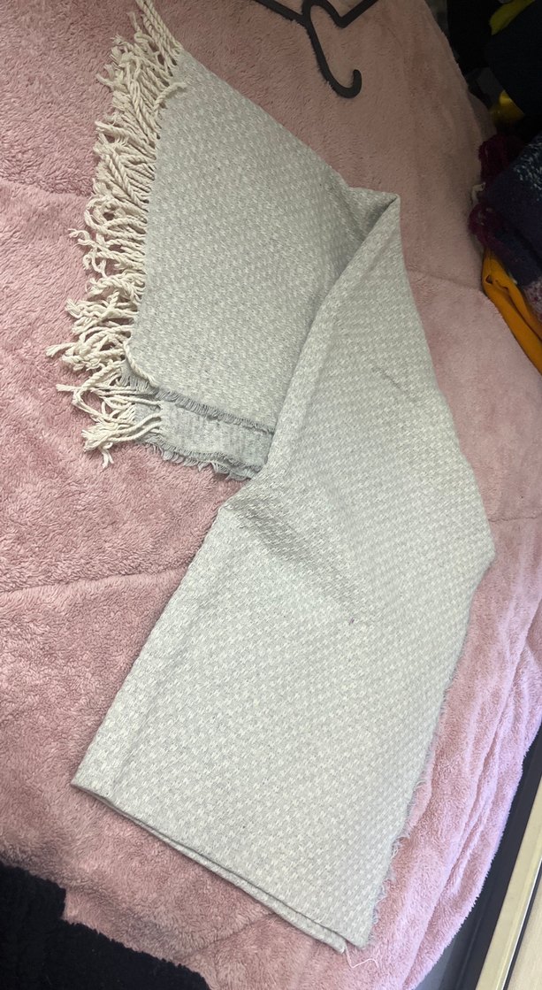 Gri renkte, düz desensiz ve püsküllü kenarlara sahip yumuşak dokulu battaniye. Sıcaklık sağlar. ️