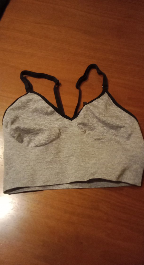 Ayarlanabilir siyah askılı, gri renkte, desen içermeyen, normal boyda atletik spor büstiyer. Sokak stili için uygundur. ️♀️