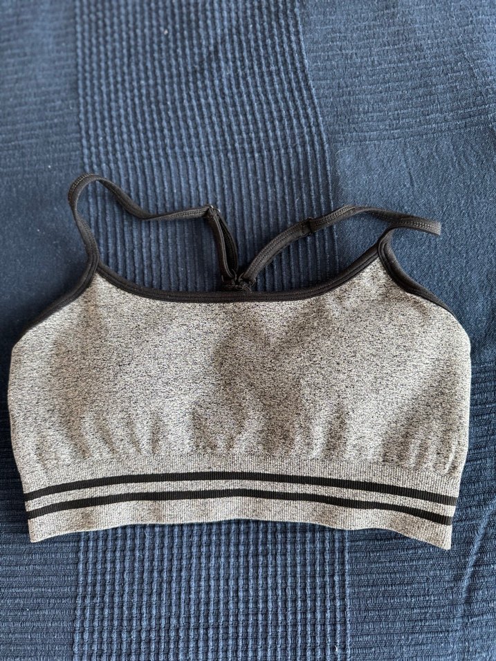 Gri renkte, ince askılı ve desen içermeyen bu atletik spor büstiyer, midi uzunlukta ve sokak stili için rahat destek sağlar.