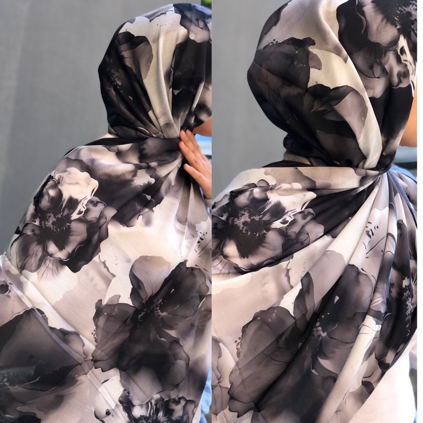 Kadınlar için drapeli, ipeksi kumaştan yapılmış, gri avant-garde çiçek desenli çağdaş tarzda şal.