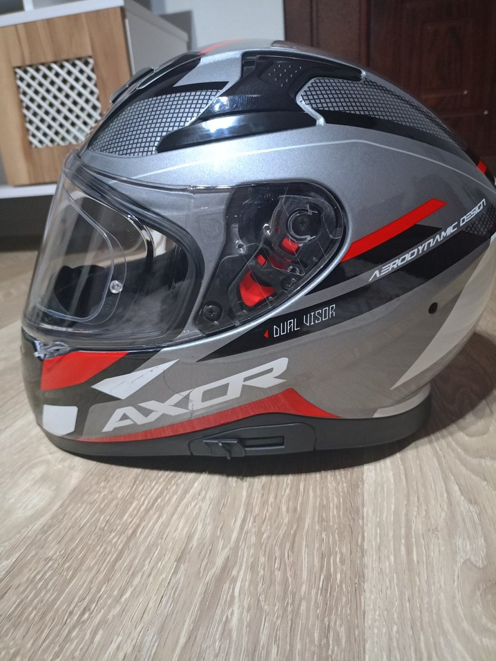 Gri Axor marka, metal malzemeden üretilmiş, baskılı desenli ve çift vizörlü, tokalı biker motokask. Rock punk ve sokak stiline uygun.