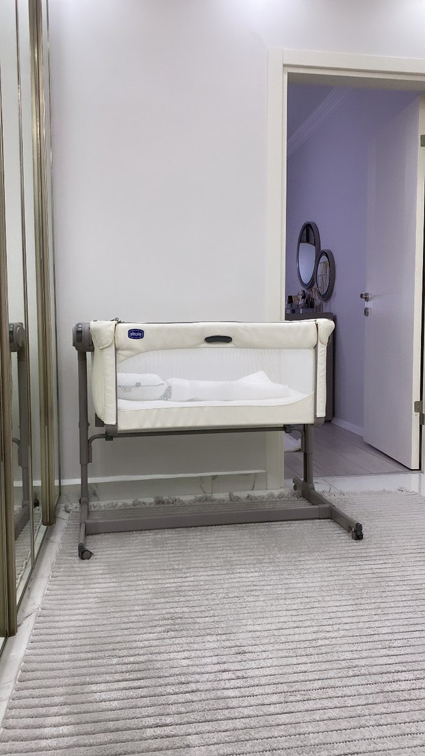 Nefes alabilen file yanlara sahip beyaz bebek beşiği, gri ayaklar ve kolay taşınabilirlik için tekerlekli sağlam çerçeveye sahiptir. ️ Ürün kurulu şekilde duruyor alacak deri olduğu için deformasyonu var Gelip alana 2.000 tl olur ist/bağcılar Barbaros