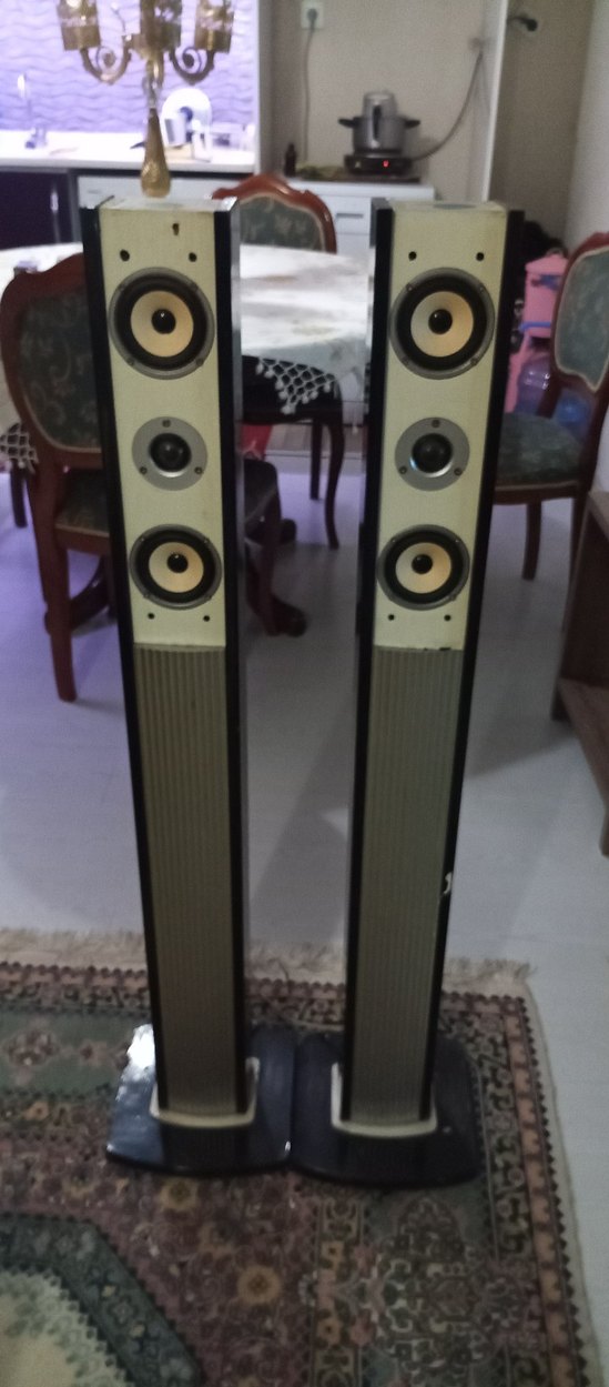 Gri renkte, çoklu sürücülerle net ses sağlayan ayaklı stereo hoparlör seti.