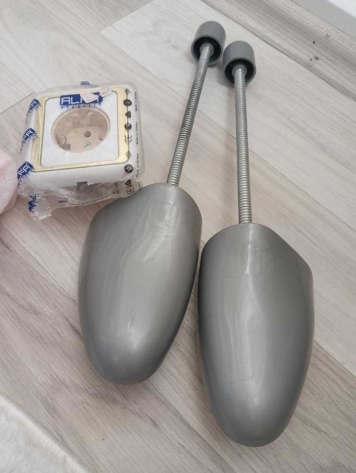 Gri renkte, ayarlanabilir metal yaylı ayakkabı kalıbı çifti, ayakkabının şeklini korumaya yardımcı olur.
