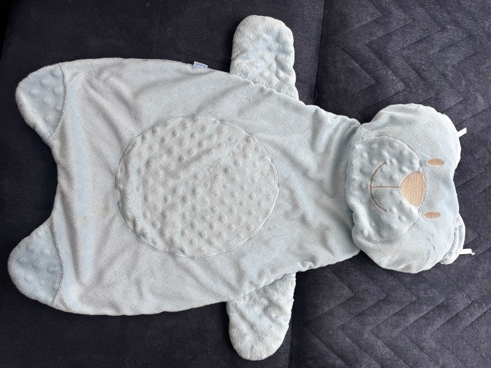 Yumuşak ve sıcak gri bebek uyku tulumu, ayı şeklinde, dokulu karın bölgesi ve nakışlı yüz detaylarıyla.