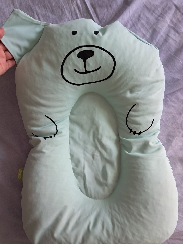 Pastel gri renkte, yumuşak kumaşlı ve sevimli ayıcık yüzü desenli bebek uyku destek yastığı. Desensiz ve nazik konfor sağlar. içi köpük suyu görünce şişiyor