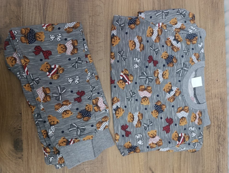 Gri renkli, ayıcık desenli, uzun kollu ve yuvarlak yakalı erkek pijama takımı. Rahat kesimi ve örgü kumaşıyla konfor sağlar.
