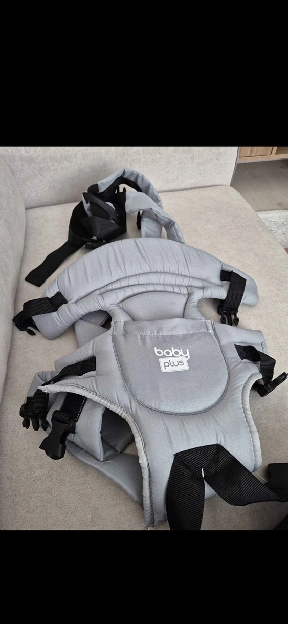 Baby Plus marka gri bebek taşıyıcı, rahatlık için dolgulu askılar ve ayarlanabilir tokalar içerir. Ergonomik destek sağlar.