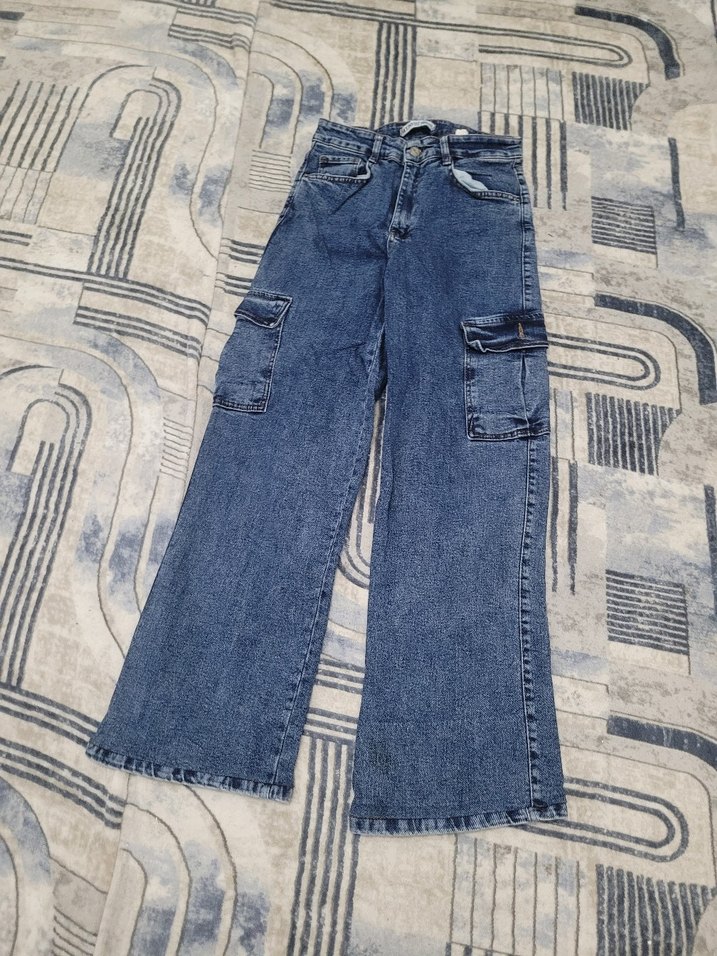 Gri batik desenli, bel detaylı, midi boy, salaş kesim mavi kot pantolon. Rahat ve günlük kullanıma uygun.