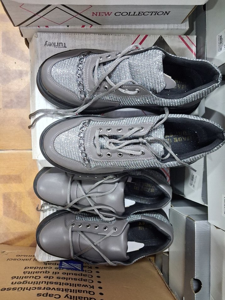 Gri renkli, blok topuklu, bağcıklı kadın spor ayakkabısı. Günlük sokak stili için kauçuk malzemeden üretilmiştir. "NEW COLLECTION" yazılıdır.