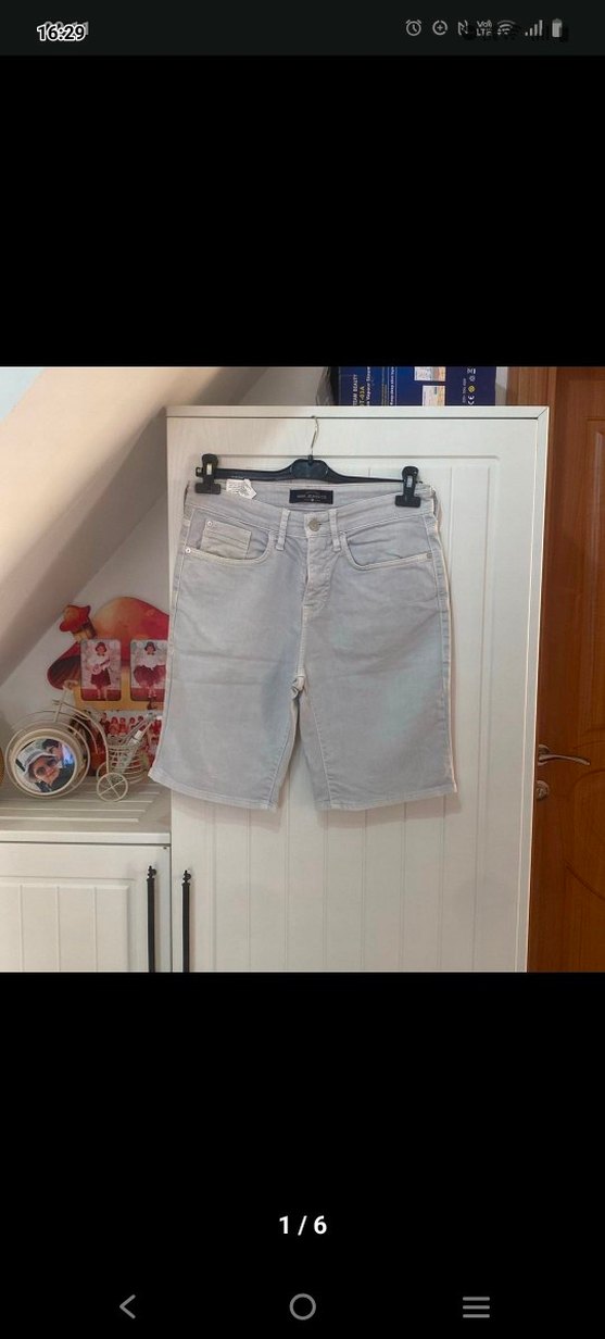 Gri renkli, bol kesim denim bermuda şort, bel kemeriyle tamamlanmış. Bağcıklı ve batik desenli, günlük kullanıma uygun sokak stili şort.