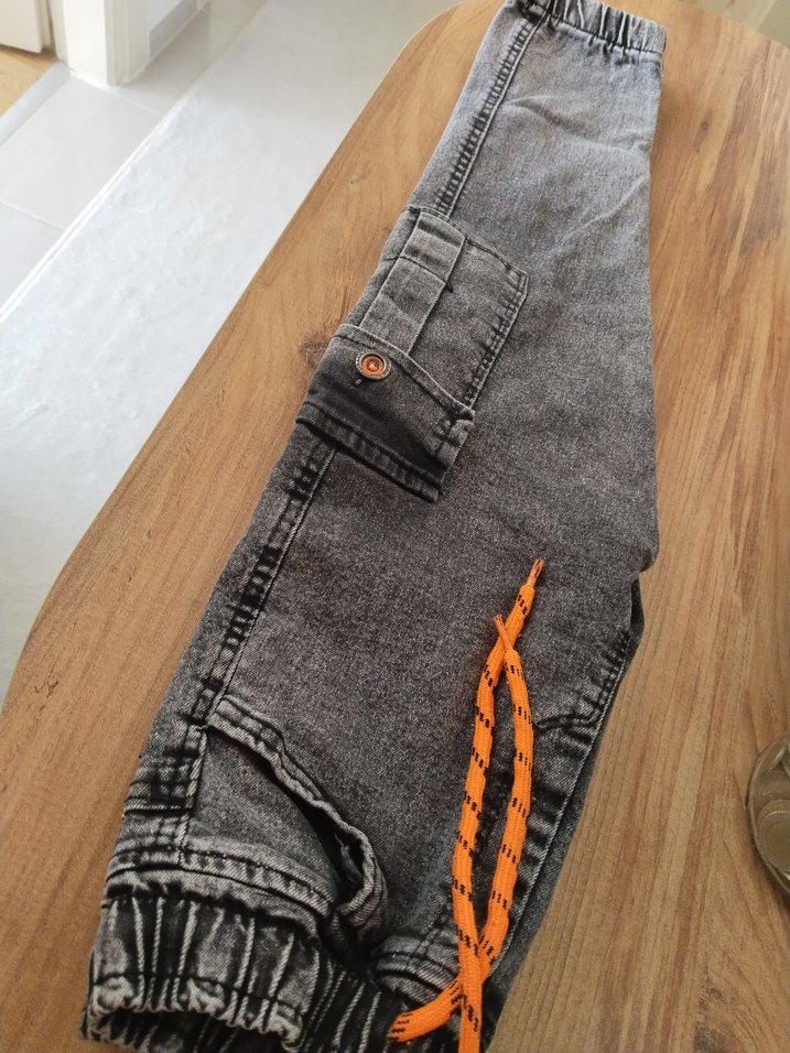 Gri renkli, elastik bel ve bağcıklı, bol kesim erkek çocuk denim pantolon. Bağcıklı ve batik desenli sokak stili pantolon. 5 6 yaş uyumlu çok az giyildi tertemizdir marka temsili çocuk butikten alınmıştı
