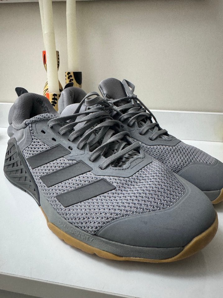 Gri renkli, bağcıklı ve desenli erkek koşu ve antrenman ayakkabısı, kauçuk tabanlıdır ve athleisure ile sokak stili için uygundur. Sadece 3 kez kullanıldı sıfır ayarında
