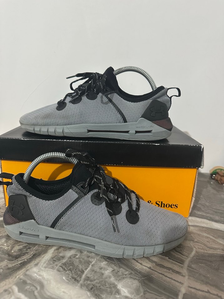 Gri renkli, bağcıklı ve baskılı desenli erkek spor ayakkabısı, kauçuk tabanlı ve sokak stili için uygun.