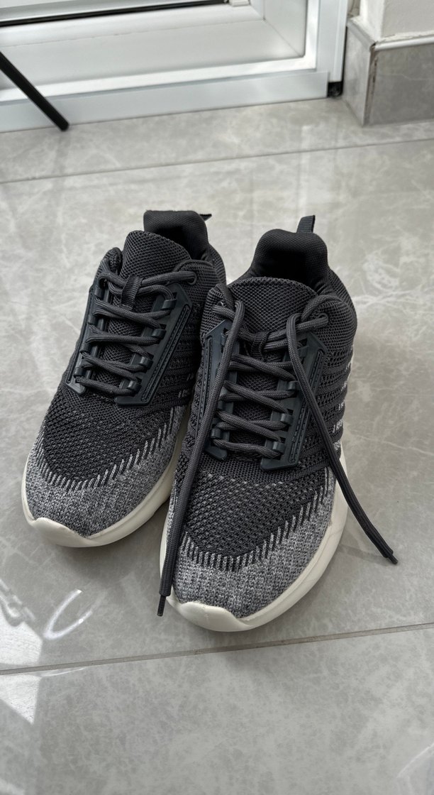 İç taban 26 cm Hiç bir kusuru yok 1 kere giyildi.Gri renkte, bağcıklı ve ince topuklu kadın spor ayakkabısı. Streetwear tarzıyla spor rahatlığını bir arada sunar.