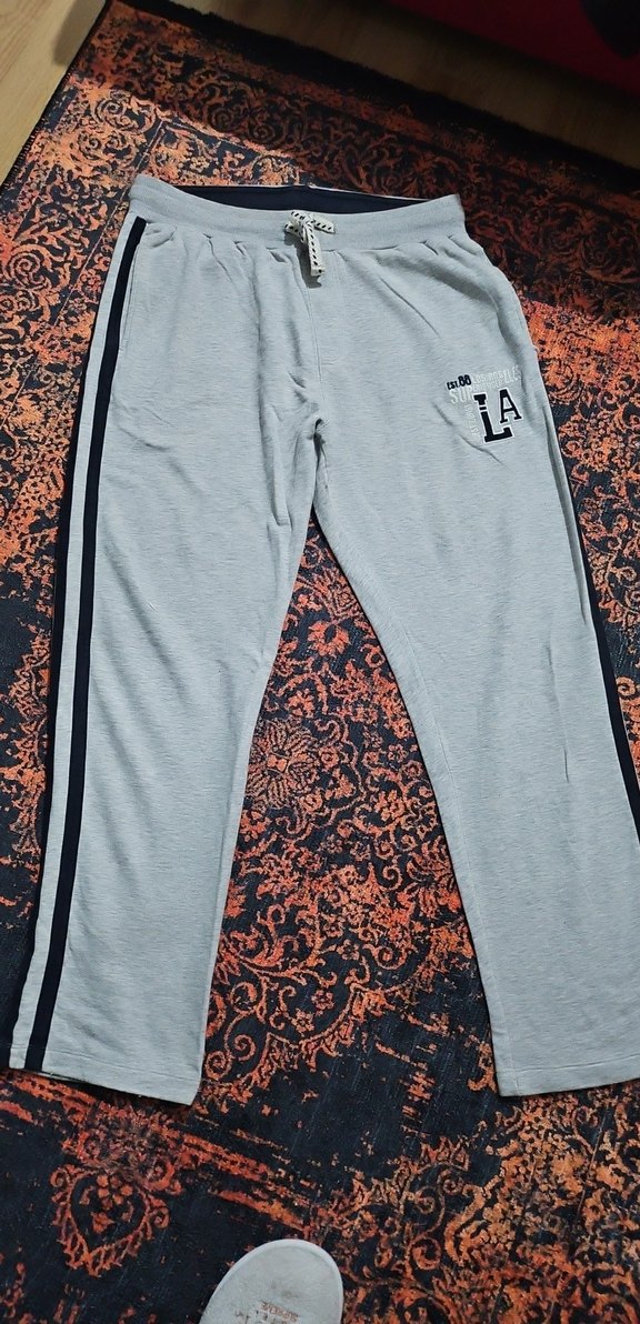 Gri renk, bağcıklı bel ve siyah yan şeritlere sahip bol kesim sweatpants. 'LA' baskılı, yumuşak sentetik kumaştan, spor ve sokak stili için uygun. ♂️